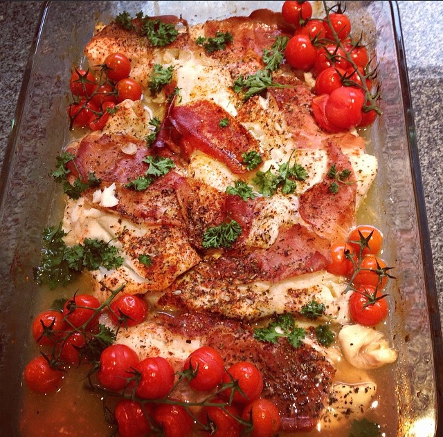 - Lastly, place two vines of cherry tomatoes on either side of the fillets and put in the oven for 14-16 mins