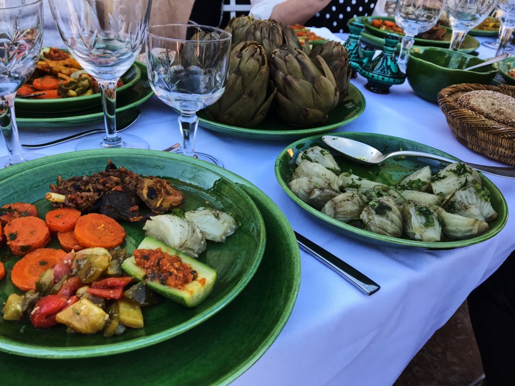 Most rooms are fitted with a traditional fireplace, ensuring your room is toasty after a day of exploring, dark wooden furnishings and boho-chic textiles. Climbing vines and cacti occupy every corner of the riad, with a rooftop terrace akin to the Hanging Gardens of Babylon, where various secluded alcoves promise privacy and tranquillity throughout the day. Here, we enjoyed breakfasts to the tune of singing birds and sunrise views, revelling in deliciously greasy delicacies, crêpes and cups of sweet Moroccan tea. Lunches, available on request, arrive at tables laid with emerald-glazed plates, soon to be disguised by colourful mezze-style dishes – think stewed aubergine, stuffed courgettes, artichoke hearts and spiced carrots, followed by flash-fried whiting and a suitably French dessert of poached pear clafoutis.