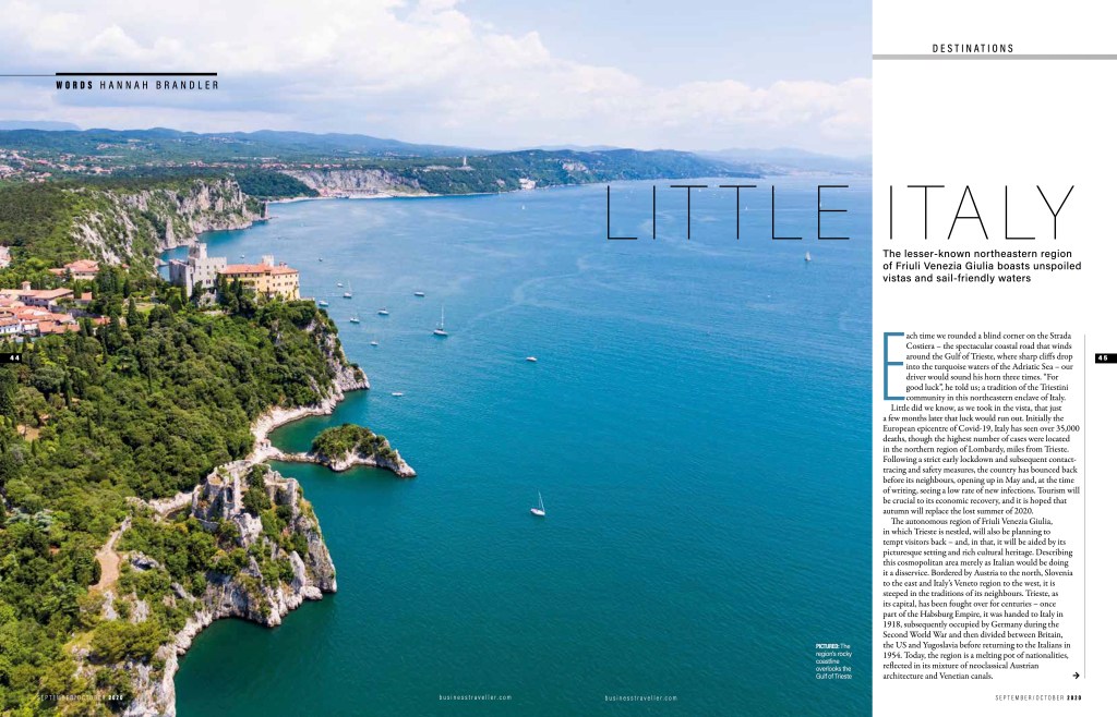 I was commissioned to write a feature on the lesser-known northeastern region of Friuli Venezia Giulia, discovering the resort of Portopiccolo, the area’s sail-friendly waters and the region’s amber-hued wines for the September/October 2020 issue of Business Traveller.
