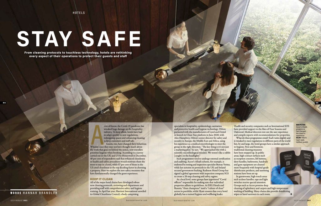 I interviewed leading hotel groups during the pandemic to find out all about the new safety measures that fundamentally changed the guest experience – from electrostatic sprayers to redesigned buffets and contactless technologies. This was published in the July/August 2021 issue of Business Traveller.