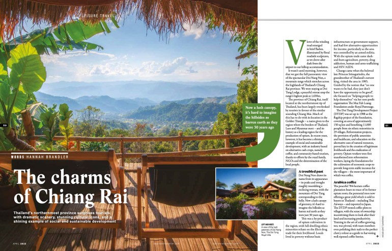 I travelled to Thailand’s northernmost province to find out about the area’s social and sustainable development, transforming from a former opium hub to an economy based on coffee and community-based tourism. This was published in Business Traveller’s April 2022 issue and led me to win Features Journalist of the Year 2022 within the Destination category at the BTJAs (Business Travel Journalism Awards).
